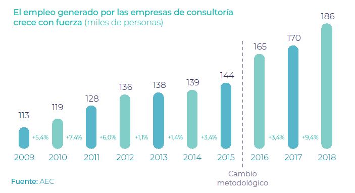 En 2018, el sector empleó a más de 186.000 profesionales, unos 16.000 más que el año anterior, lo que supone un crecimiento del 9,4%. Esta tendencia de creación de empleo en el sector se mantiene de forma continuada desde 2009. “El de la Consultoría es un sector que nunca ha dejado de general empleo, ni siquiera durante los peores años de la crisis, además, efectúa muy poca contratación temporal”, ha afirmado Salgado.