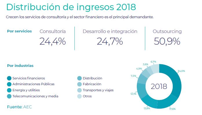 En cuanto a la distribución de ingresos por tipo de servicio, en 2018 la consultoría representó el 24,4% de los ingresos; los proyectos de desarrollo e integración, el 24,7%; y el outsourcing, el 50,9%. El crecimiento de los servicios de consultoría viene impulsado por la demanda de transformación digital de las organizaciones. En 2018 han representado un 24,4%, porcentaje muy superior al 16% de 2012. Los ingresos por estos servicios se han incrementado un 14% respecto a 2017, hasta 3.347 millones de euros.