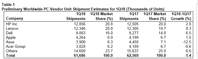 61,7 millones de unidades de PC fueron comercializadas en el primer trimestre de 2018, una disminución del 1,4% con respecto al primer trimestre de 2017, según los resultados preliminares de Gartner. Las regiones de Asia/ Pacífico y EEUU experimentaron un descenso de las ventas, mientras que otras regiones experimentaron un crecimiento mínimo, pero que no fue suficiente para impulsar el crecimiento general de la industria del PC.