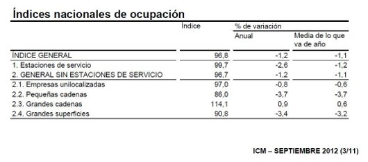 Respecto al índice de ocupación en el comercio al por menor, la disminución fue del 1,2%. Sólo las grandes cadenas incrementaron el número de ocupados en un 0,9% respecto al mismo período de 2011. La media de contratación en los nueve primeros meses de 2012 presenta una variación del -1,1%.
