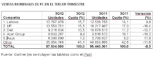 Es lo que los anglosajones llaman wait and see. El mercado se ha ralentizado porque está a la espera de la salida del nuevo Windows 8. Las cifras de venta de PC (no se incluyen tabletas como el iPad) a nivel mundial de Gartner así lo muestran: los 87,5 millones de equipos comercializados durante el tercer trimestre del año suponen una caída del 8,3% con respecto al mismo periodo de 2011.