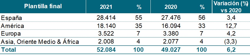 La plantilla final al cierre de 2021 estaba formada por 52.084 empleados, lo que ha supuesto un incremento del 6,2% frente a 2020 (3.057 empleados más), concentrándose ese incremento en América (2.046 empleados más) y en España (938 empleados más). En el trimestre, la plantilla final al cierre de diciembre de 2021 aumentó un 1,5% respecto a septiembre de 2021 (774 empleados más). Por su parte, la plantilla media en 2021 aumentó un 3,9% respecto a 2020.