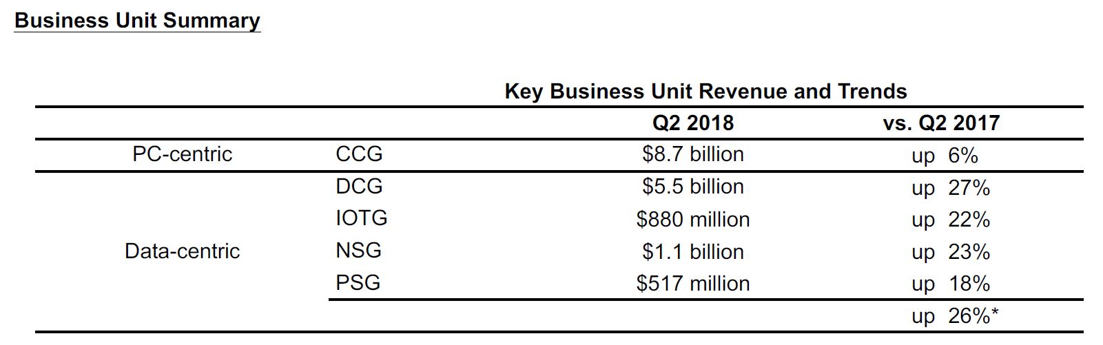 En el segundo trimestre, Intel logró un crecimiento en los ingresos en todos los segmentos de negocios. El negocio centrado en PC creció un 6%, impulsado por la fuerte demanda de productos de alto rendimiento de Intel, con especial fuerza en juegos y comercial. El llamado Client Computing Group (CCG), la unidad que vende CPU para ordenadores personales, lanzó varios procesadores Intel Core de la 8ª generación, que incluyen: el procesador Intel Core i9 de 8ª generación para portátiles de alto rendimiento, 8ª generación Intel Core vPro procesadores para empresas, y el procesador de edición limitada Intel Core i7-8086K de la 8ª generación para juegos.